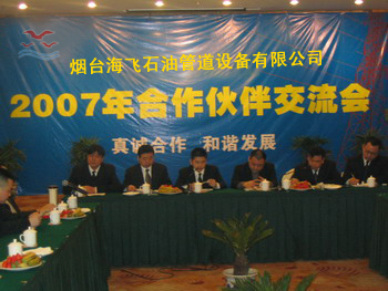 3月18日上午10點,煙臺海飛石油管道設(shè)備有限公司2007年合作伙伴交流會在青島國際大酒店隆重舉行。共有來自全國各地的海飛供應(yīng)商代表50余人參加了會議,海飛公司董事長兼總經(jīng)理徐大同,副總經(jīng)理李大海,財務(wù)總監(jiān)王霞等公司領(lǐng)導(dǎo)出席會議。